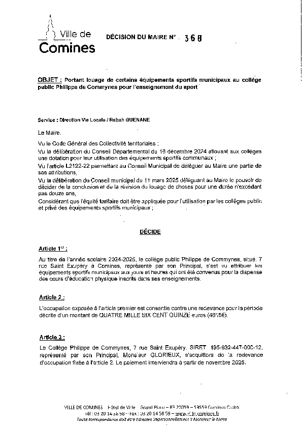 Louage de certains équipements sportifs municipaux au collège Philippe de Commynes pour l'enseignement du sport au titre de l'année scolaire 2024-2025