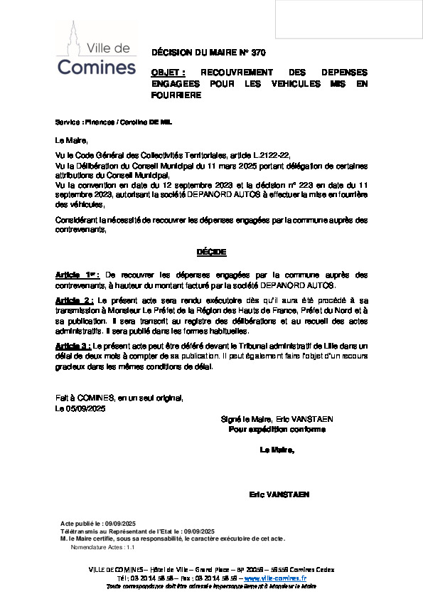 Recouvrement des dépenses engagées pour les véhicules mis en fourrière