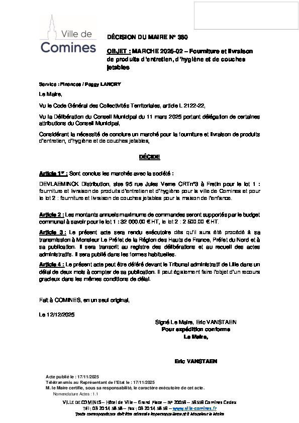 SOCIETE DEVLAEMINCK DISTRIBUTION (59273 FRETIN) - Marché 2025-02 - Fourniture et livraison de produits d'entretien, d'hygiène et de couches jetables - Lot 1 : Fourniture et livraison de produits d'entretien et d'hygiène pour la ville de Comines et lot 2 : fourniture et livraison de couches jetables pour la maison de l'enfance