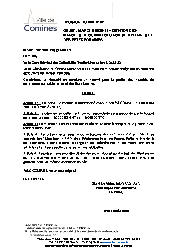 SOCIETE SOMAREP (75116 PARIS) - Marché 2025-11 - Gestion des marchés de commerces non sédentaires et des fêtes foraines