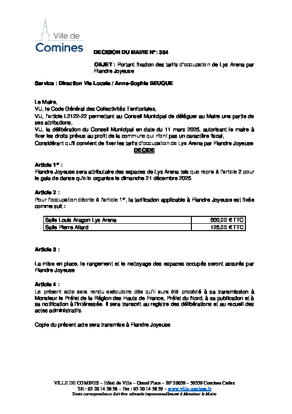 Fixation des tarifs d'occupation de Lys Arena par Flandres Joyeuses - Gala de danse le 21/12/2025