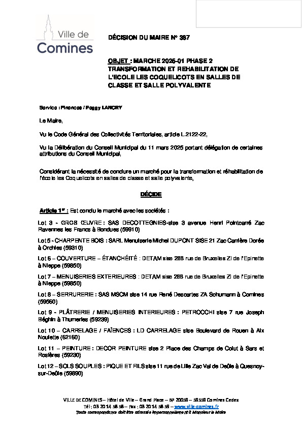 Marché 2025-01 - Phase 2 - Transformation de l'école Les Coquelicots en salle de classe et salle polyvalente