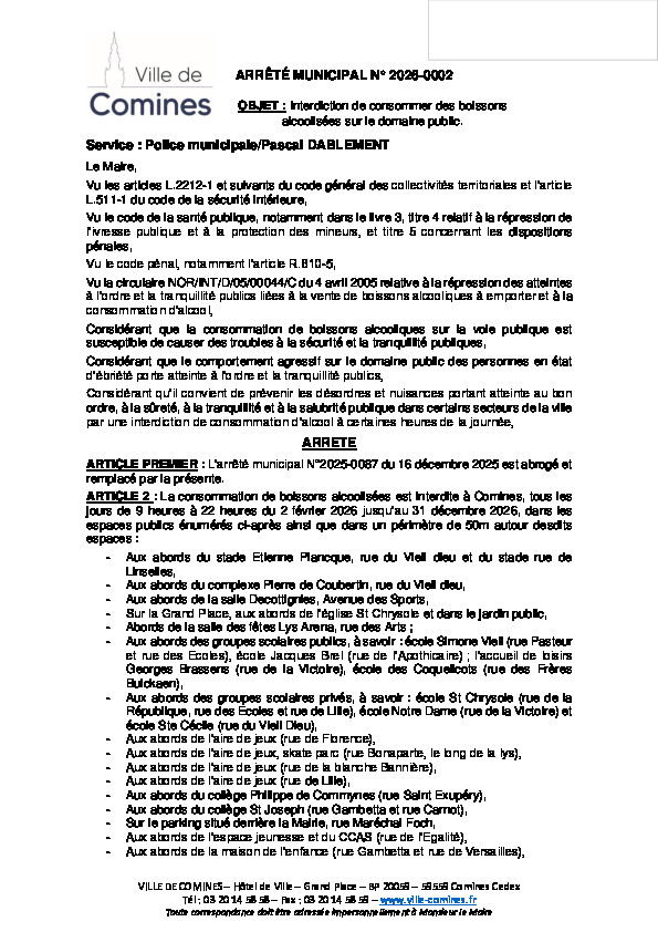Interdiction de consommer des boissons alcoolisées sur le domaine public du 02/02 au 31/12/2026