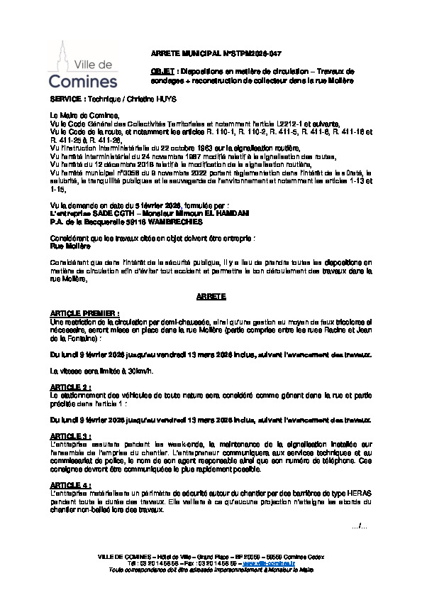 ETS SADE CGTH - Travaux de sondages + reconstruction de collecteur dans la rue Molière du 09/02 au 13/03/2026 inclus