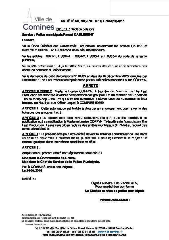 Ouverture d'un débit de boissons par l'association The last production le 07/02/2026