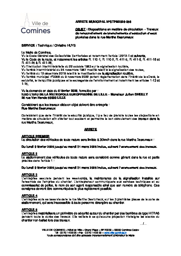 ILEO - Travaux de renouvellement de branchements d'adduction d'eaux pluviales dans la rue Martha Desrumaux du 09/02 au 31/03/2026 inclus