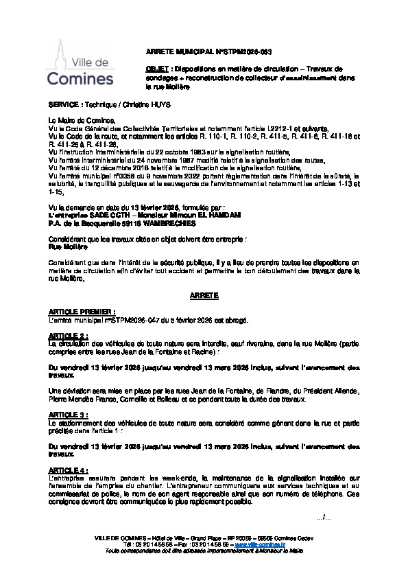 ETS SADE CGTH - Travaux de sondages + reconstruction de collecteur d'assainissement dans la rue Molière du 13/02 au 13/03/2026 inclus