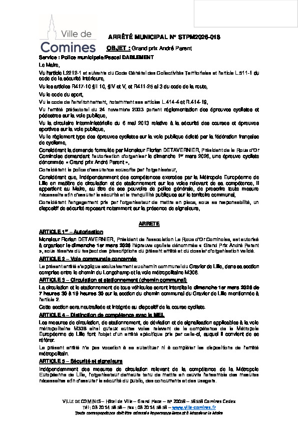 Course cycliste " Grand Prix André Parent " - Règlementation de stationnement et de circulation le 01/03/2026