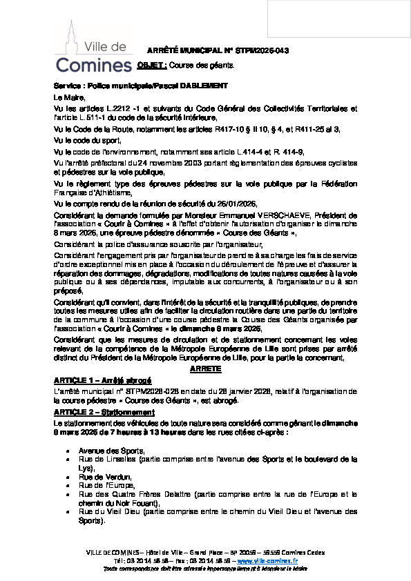 Course des géants - Règlementation de stationnement et de circulation le 08/03/2026