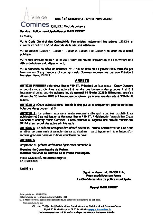 Ouverture d'un débit de boissons par l'association Crazy dancers of country les 14 et 15/02/2026