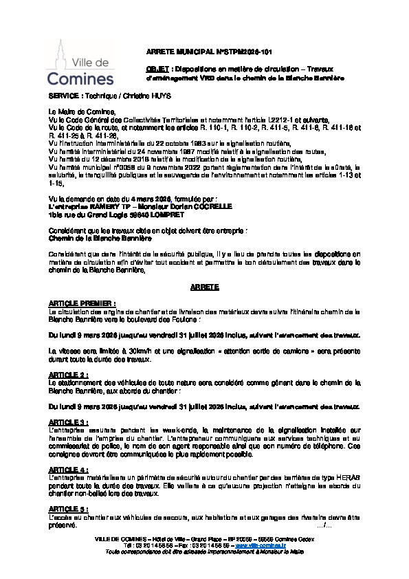 ETS RAMERY TP - Travaux d'aménagement VRD dans le chemin de la Blanche Bannière du 09/03 au 31/07/2026 inclus