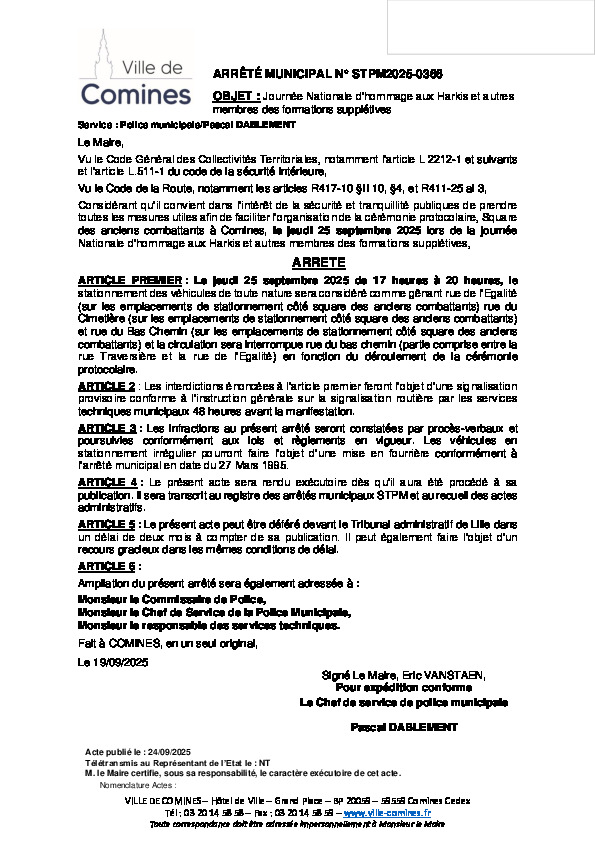 Journée Nationale d'hommage aux Harkis et autres membres des formations supplétives - Règlementation de stationnement le 25/09/2025