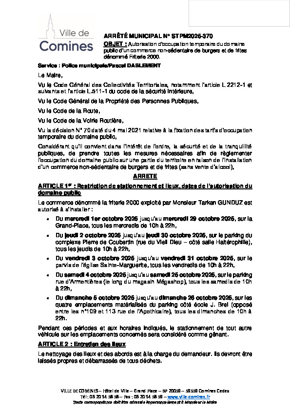 Autorisation d'occupation temporaire du domaine public d'un commerce non-sédentaire de burgers et de frites dénommé " Friterie 2000 " du 01 au 31/10/2025