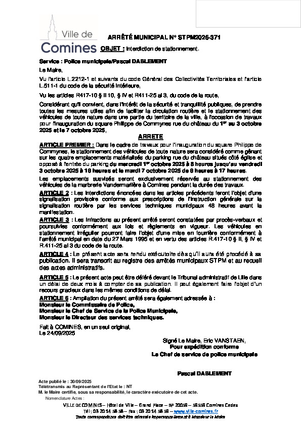 Travaux pour l'inauguration du square Philippe de Commynes rue du Château - Règlementation de stationnement du 01 au 07/10/2025