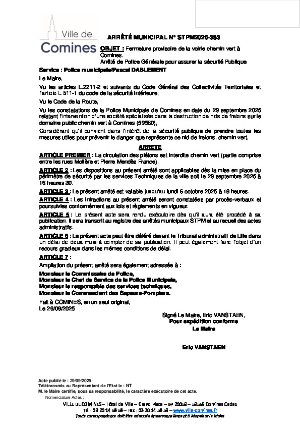 Fermeture provisoire de la voirie chemin vert à Comines (partie comprise entre les rues Molière et Pierre Mendès France) jusqu'au 06/10/2025