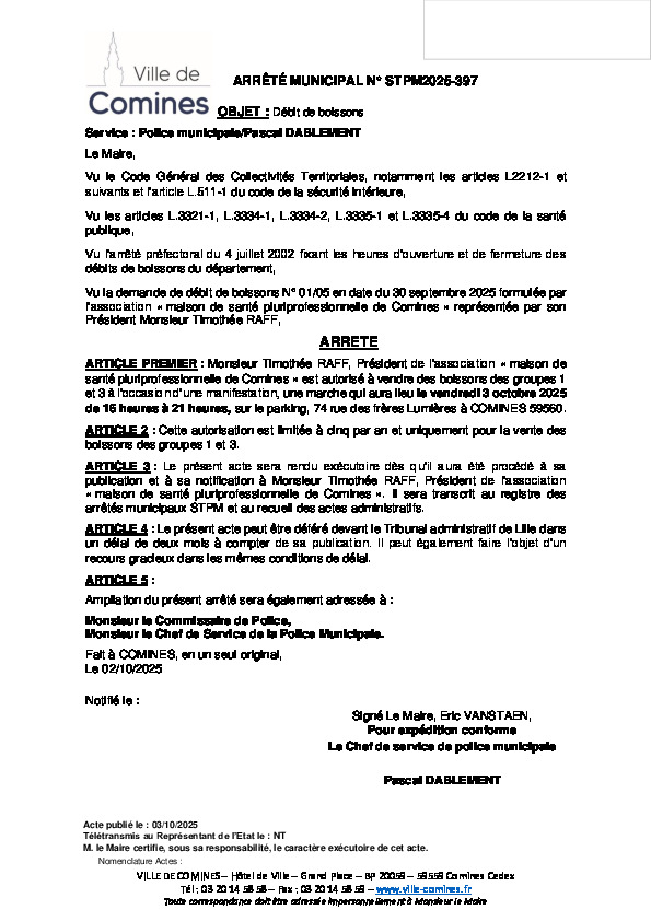 Ouverture d'un débit de boissons par l'association " Maison de santé pluriprofessionnelle de Comines " le 03/10/2025