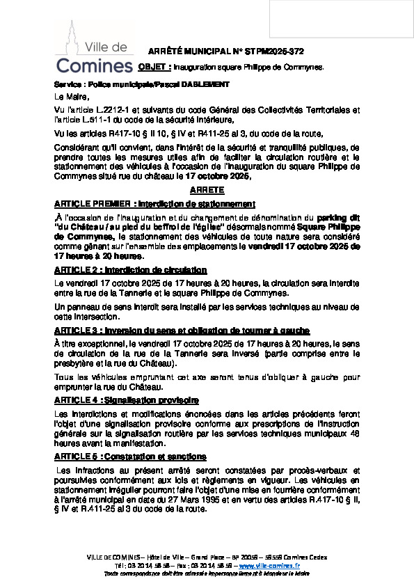 Inauguration square Philippe de Commynes - Règlementation de stationnement et de circulation le 17/10/2025