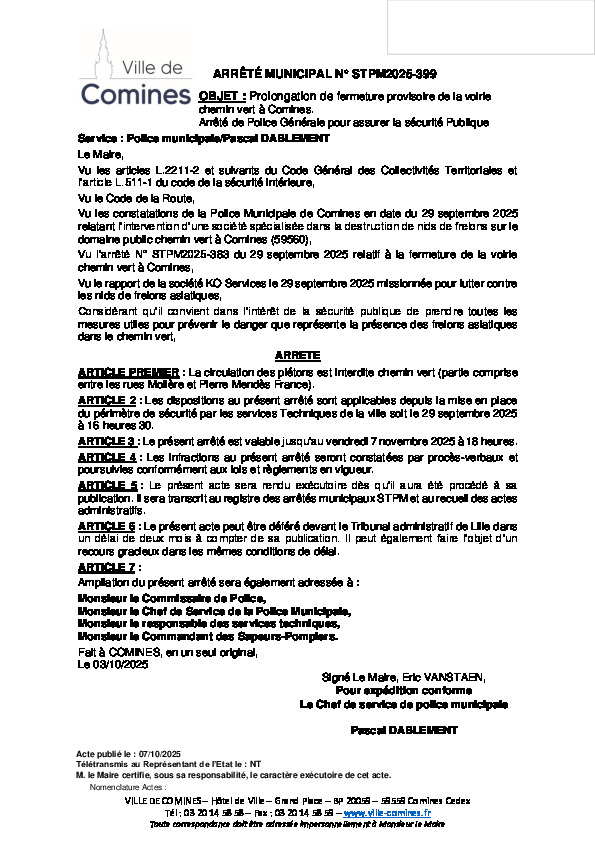 Fermeture provisoire de la voirie chemin vert à Comines (partie comprise entre les rues Molière et Pierre Mendès France) jusqu'au 07/11/2025