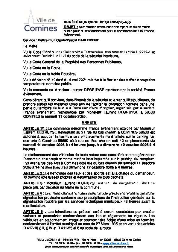 Autorisation d'occupation temporaire du domaine public pour stationnement d'un commerce intitulé France évènement du 11 au 12/10/2025