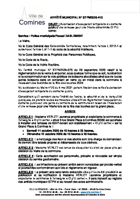 Autorisation d'occupation temporaire du domaine public d'une terrasse pour une friterie dénommée " O P'tit cornet " les 11 et 12/10/2025
