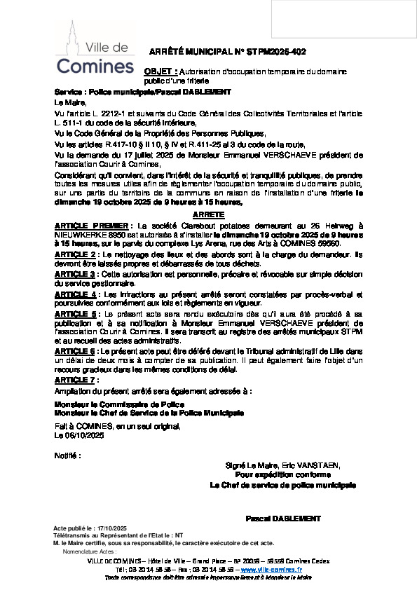 Autorisation d'occupation temporaire du domaine public d'une friterie de la société Clarebout le 19/10/2025
