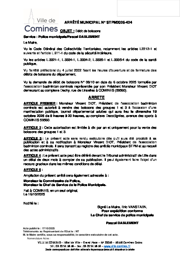 Ouverture d'un débit de boissons par l'association Badminton cominois le 19/10/2025