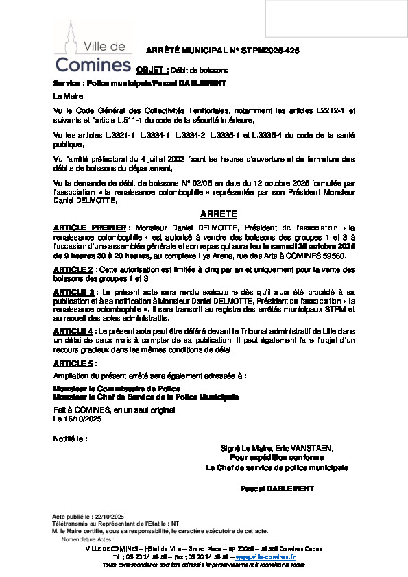 Ouverture d'un débit de boissons par l'association La renaissance colombophile le 25/04/2025