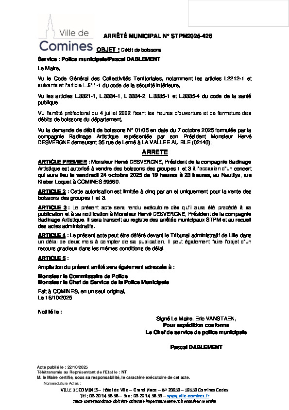 Ouverture d'un débit de boissons par la compagnie Badinage Artistique le 24/10/2025
