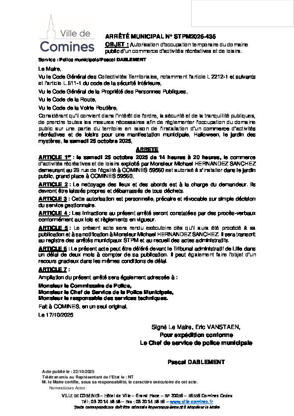 Autorisation d'occupation temporaire du domaine public d'un commerce d'activités récréatives et de loisirs dans le cadre d'Halloween le 25/10/2025