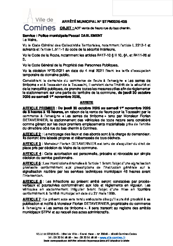 Autorisation d'occupation temporaire du domaine public d'un commerce dénommé Les serres de Timborne du 29/10 au 01/11/2025