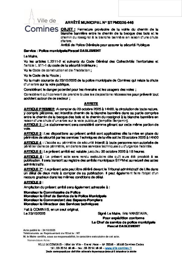 Fermeture provisoire de la voirie du chemin de la Blanche Bannière (entre le chemin de la Becque des bois et le chemin du Rossignol) à la Blanche Bannière) du 23 au 30/10/2025