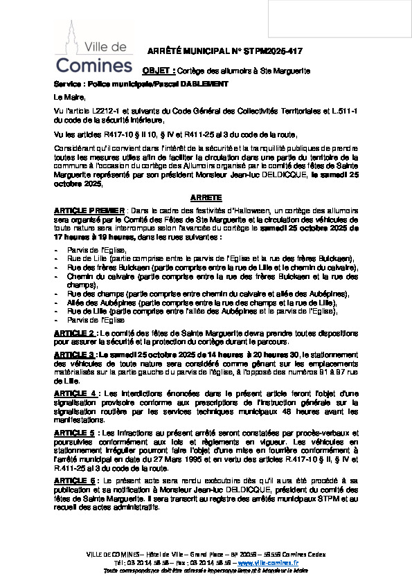 Cortège des allumoirs à Ste Marguerite - Règlementation de circulation et de stationnement le 25/10/2025