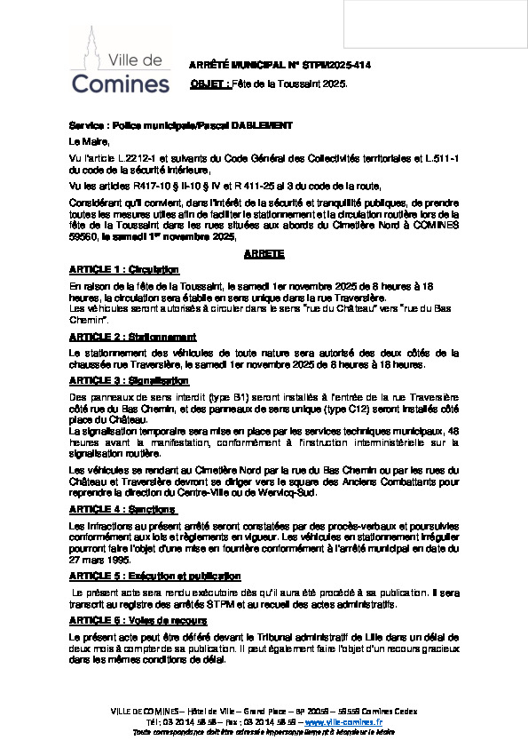 Fête de la Toussaint 2025 - Règlementation de ciruclation et de stationnement le 01/11/2025