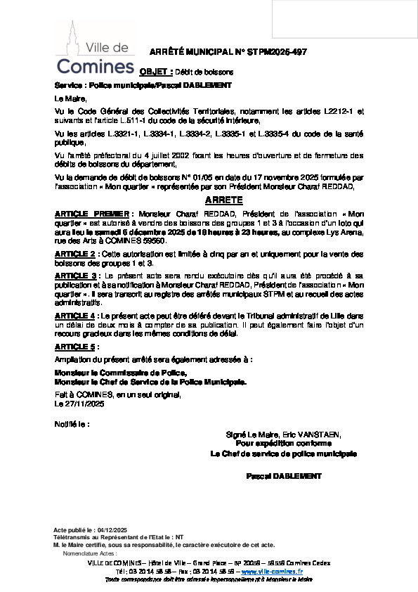 Ouverture d'un débit de boissons par l'association Mon quartier le 06/12/2025