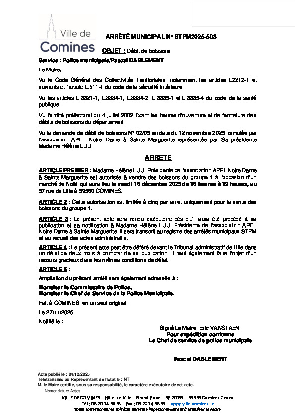 Ouverture d'un débit de boissons par l'association APEL Notre Dame à Saine Marguerite le 16/12/2025