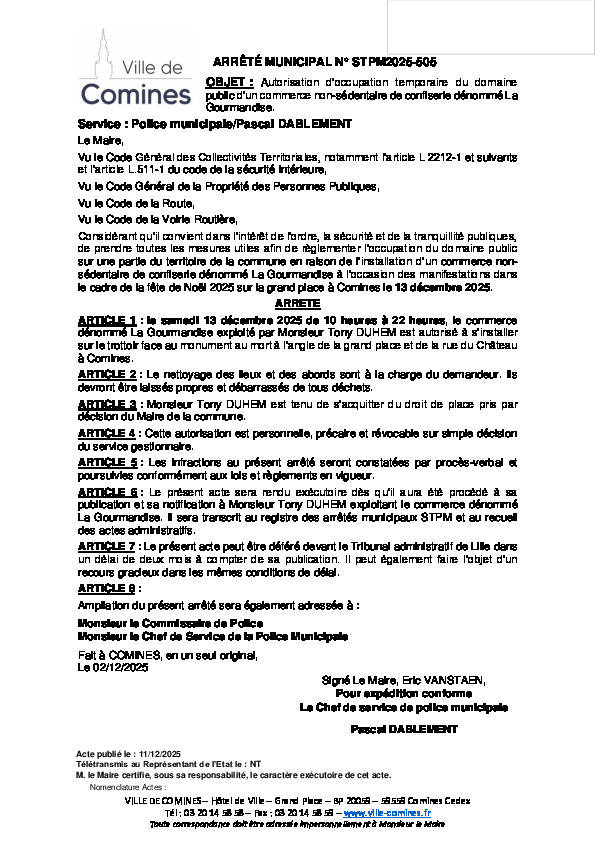 Autorisation d'occupation temporaire du domaine public d'un commerce non-sédentaire de confiserie dénommé Le Gourmandise le 13/12/2025