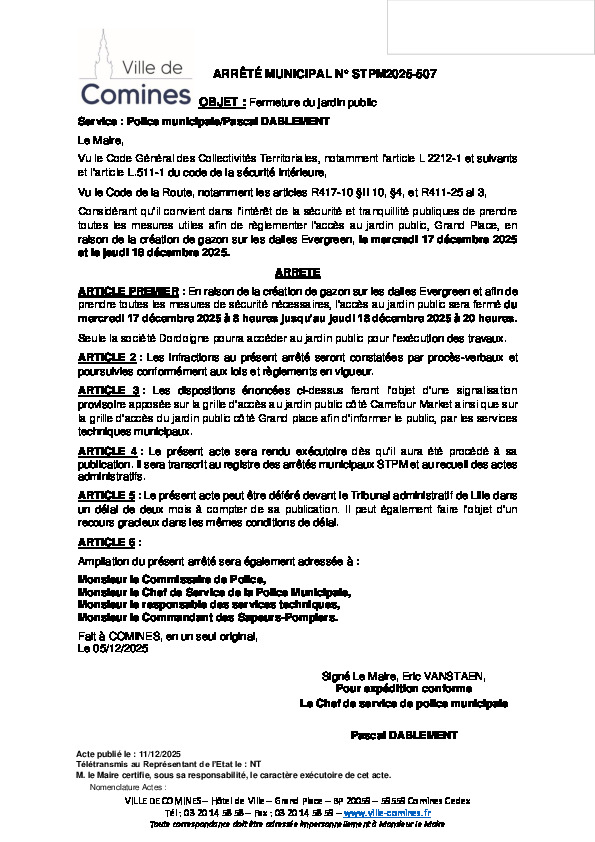 Création d'un gazon sur les dalle Evergreen - Fermeture du jardin public les 17 et 18/12/2025