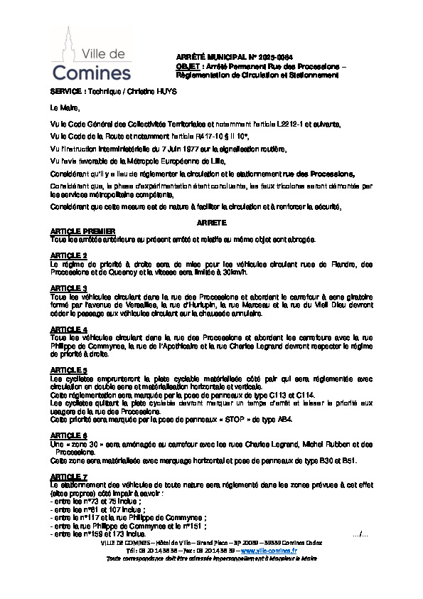 Règlementation de circulation et de stationnement rue des Processions