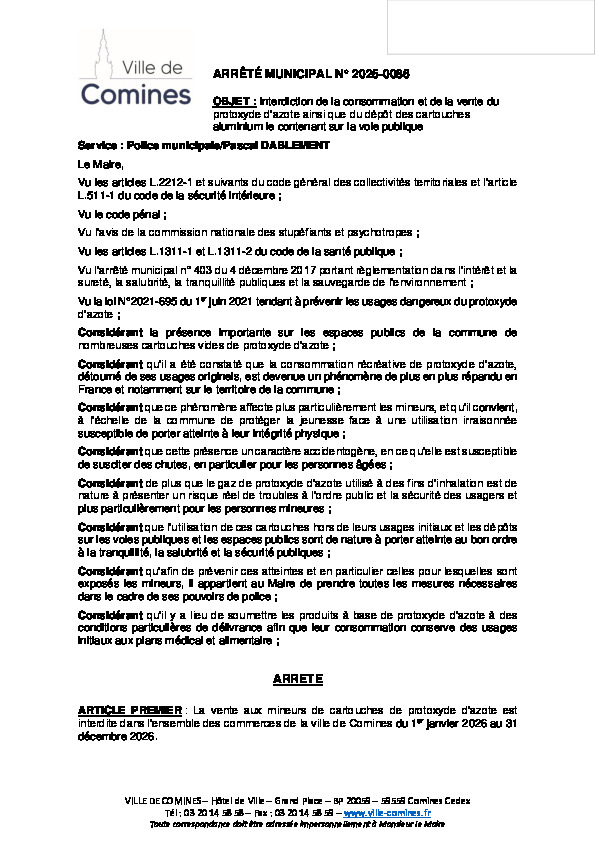Interdiction de la consommation et de la vente du protoxyde d'azote ainsi que du dépôt des cartouches aluminium le contenant sur la voie publique du 01/01 au 31/12/2026