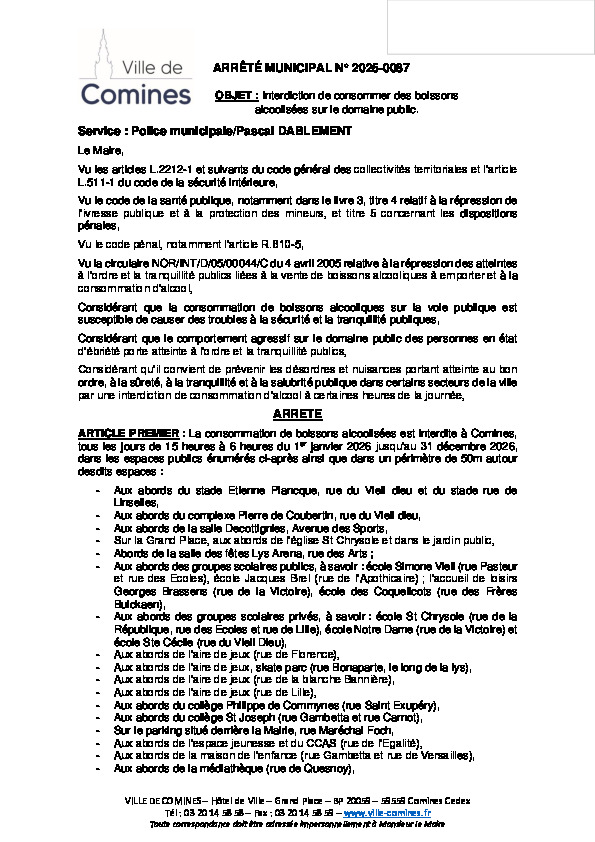 Interdiction de consommer des boissons alcoolisées sur le domaine public du 01/01 au 31/12/2026