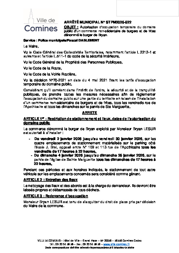 Autorisation d'occupation du domaine public d'un commerce non-sédentaire de burgers et de frites dénommé le burger de Bryan du 02/01 au 30/01/2026