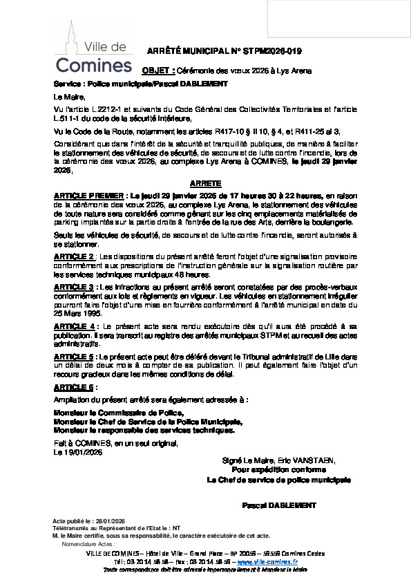 Cérémonie de Vœux 2026 à Lys Arena - Règlementation de stationnement le 29/01/2026