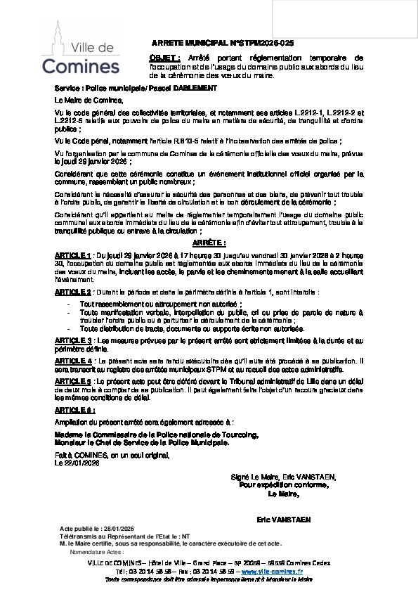 Réglementation temporaire de l'occupation et de l'usage du domaine public aux abord du lieu de la cérémonie des Vœux du Maire les 29 et 30/01/2026