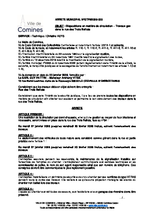 SARL GUY PATTYN - Travaux gaz 94 rue des Trois Ballots du 27/01 au 20/02/2026 inclus