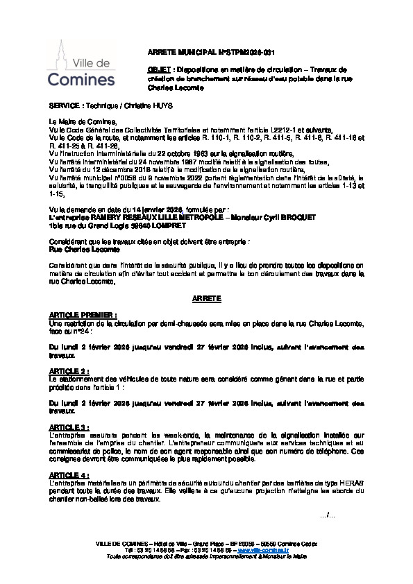 ETS RAMERY RESEAUX LILLE METROPOLE - Travaux de création de branchement sur réseau d'eau potable 24 rue Charles Lecomte du 02 au 27/02/2026 inclus