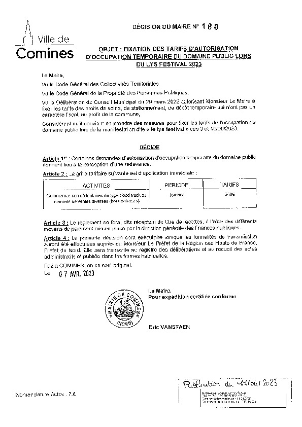 Fixation du tarif de l'autorisation de l'occupation du domaine public par les opérateurs LIME et TIER MOBILITY