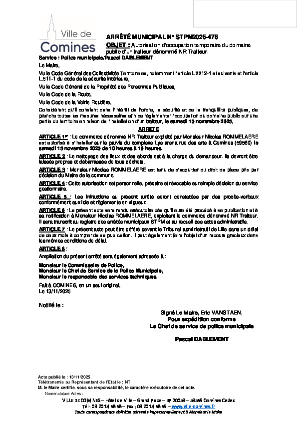Autorisation d'occupation temporaire du domaine public d'un traiteur dénommé NR Traiteur le 15/11/2025