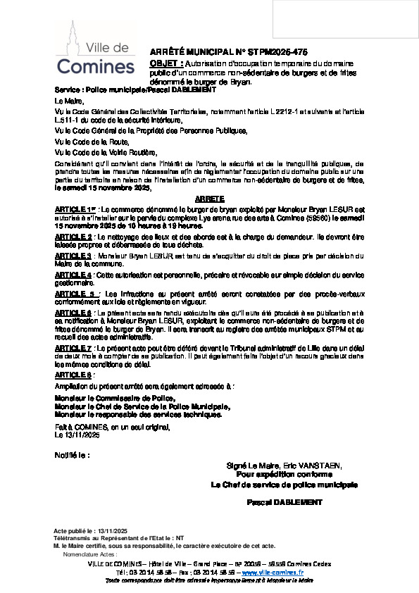 Autorisation d'occupation temporaire du domaine public d'un commerce non-sédentaire de burgers et de frites dénommé Le burger de Bryan le 15/11/2025