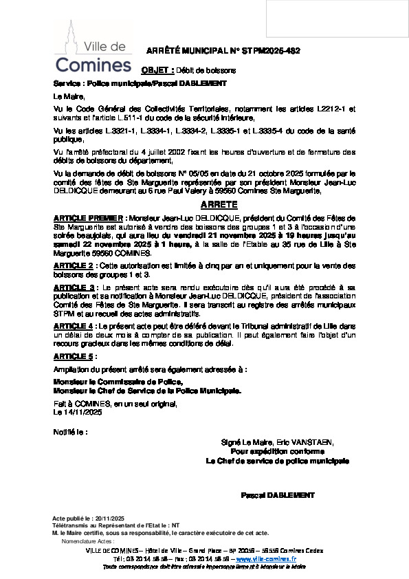 Ouverture d'un débit de boissons par le comité des fêtes de Ste Marguerite les 21 et 22/11/2025