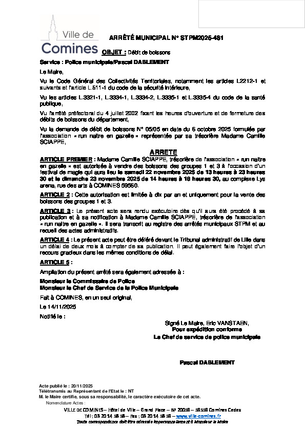 Ouverture d'un débit de boissons par l'association Run naitre en gazelle les 22 et 23/11/2025